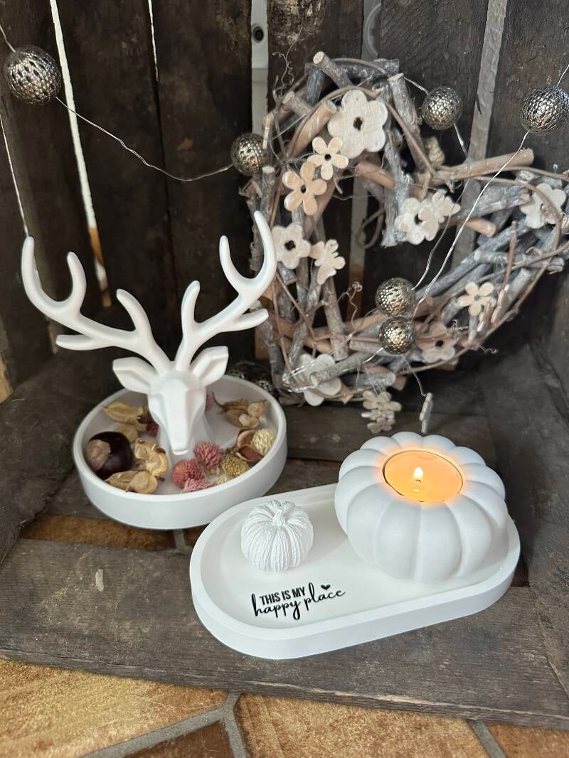 Deko-Tablett oval, Kürbis klein, geriffelter bauchiger Kerzenhalter mit Kerze, 15,00€