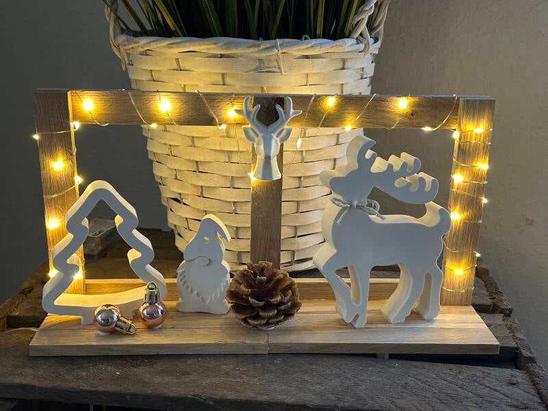 Leucht-Regal mit Tannenbaum, Wichtel und Rentieren, 22,00€