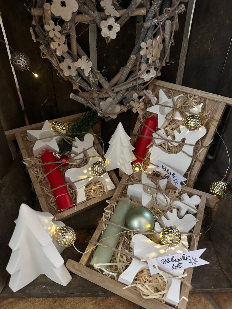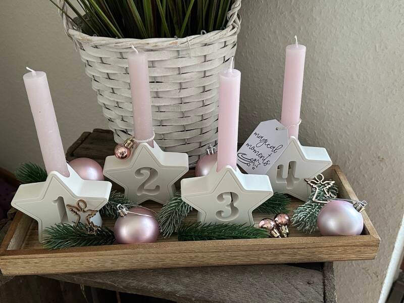 Eckiges Holztablett, Sternzahlen mit Kerzen, Dekoelemente, 30,00€